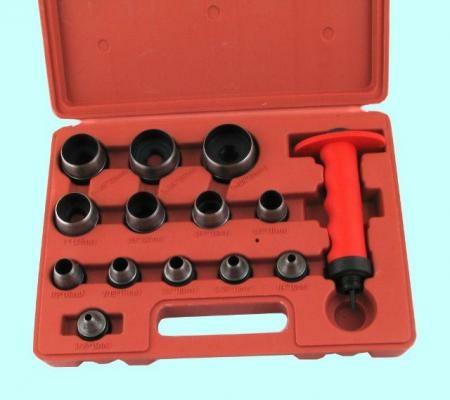 - В наборе представлено 14 пробойников с диаметрами от 5 до 35 мм, что позволяет работать с различными размерами высечек.