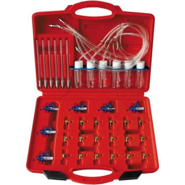 Набор для тестирования дизельных систем Сорокин Common rail 21.28 можно визуально оценить работоспособность топливных форсунок дизельного двигателя. Тестирование основано на принципе обратного слива, то есть работа форсунок косвенно оценивается по количеству топлива, слитого через обратную магистраль. Оценка проводится по степени наполняемости прозрачных мерных колб для каждой форсунки. Данный набор подойдет для дизельных систем Common rail большинства производителей дизельных двигателей европейских и азиатских производителей.