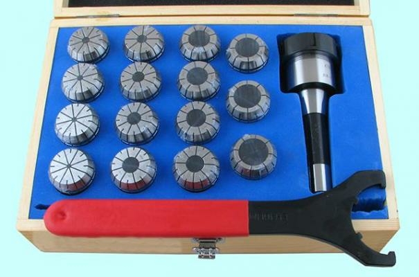 Цанги: 3-4, 4-5, 5-6, 7-8, 9-10, 11-12, 12-13, 14-15, 15-16, 17-18, 19-20, 20-21, 22-23, 24-25, 25-26мм.Хвостовик R8 (Bridgeport R8) - комбинированный конический хвостовик с внутренней резьбой 7/16"- 20UNF.