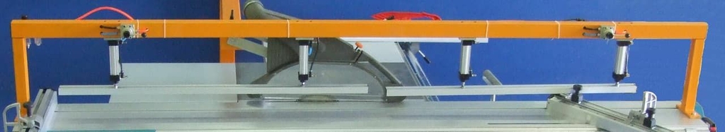 - за счет плотного прижима плиты, листа, пакета независимо от их кривизны или коробоватости нет необходимости поднимать подрезную пилу, при этом уменьшается ее износ и сокращается время на ее заточку;