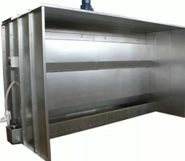 Создаваемый вентилятором воздушный поток отводит взвесь ЛКМ/клея из рабочей зоны. Загрязненный воздух очищается, проходя через водяную завесу. Крупные частицы мусора попадают в поддон с водой, находящийся под рабочей зоной.