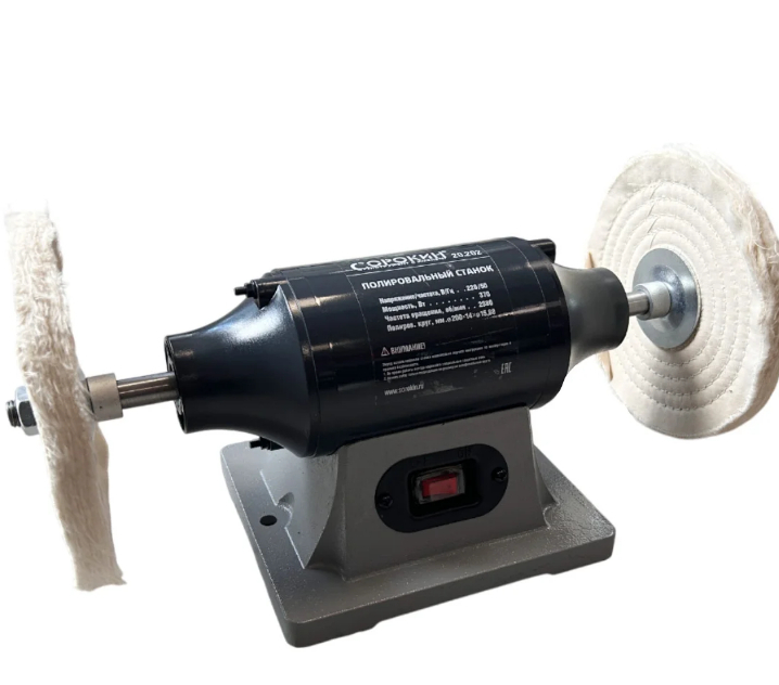 Станок, предназначен для проведения процесса полировки различных материалов; металл, камень, дерево, укомплектован хлопчатобумажными полировальными кругами диаметром 200мм.