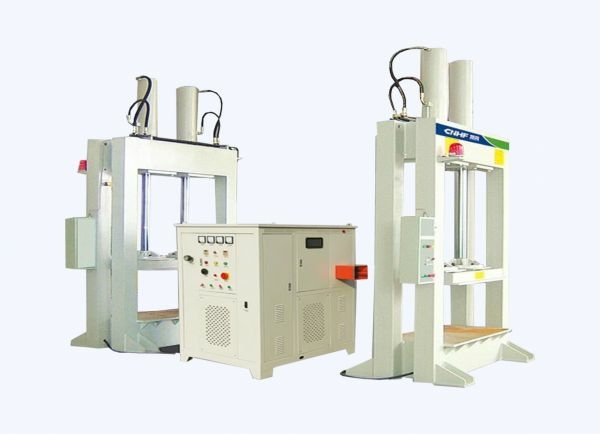Гидравлический пресс с большим раскрытием плит предназначен для изготовления гнутоклееных изделий, многослойных прессований в пачках и т.п. Нагрев и кристаллизация клеев происходит или естественным образом, или с использованием ТВЧ.
