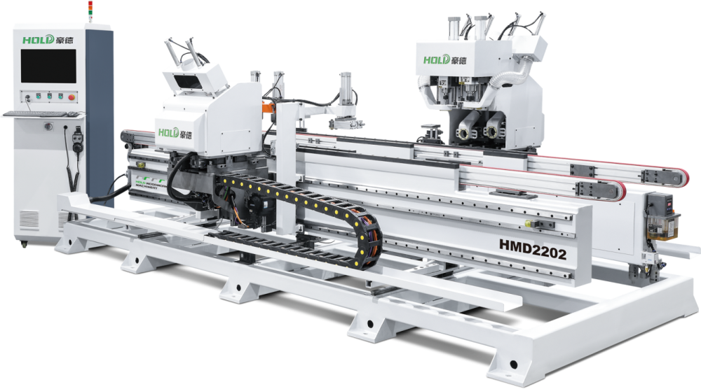 Проходной обрабатывающий центр с ЧПУ для фрезерования отверстий в дверных полотнах и коробках под замок и петли HOLD HMD2202
