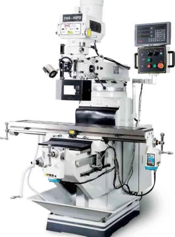 Универсальный фрезерный станок PROMA FNS–55PD с УЦИ предназначен для обработки резанием при помощи осевого режущего инструмента, наружных и внутренних плоских и фасонных поверхностей, пазов, уступов, тел вращения, отверстий, резьбовых соединений, зубьев зубчатых колёс и т.п. Станок находит широкое применение в мелкосерийном производстве и в производстве средней серии, в ремонтных цехах, в слесарных и столярных мастерских, на складах и т.п. Станок имеет девять ступеней вращения шпинделя при горизонтальной обработке и восемь ступеней при вертикальной обработке, это повышает эффективность обработки деталей. На цифровом дисплее отображается скорость вращения шпинделя и положение стола в двух плоскостях, что обеспечивает удобство контроля рабочего процесса оператором.