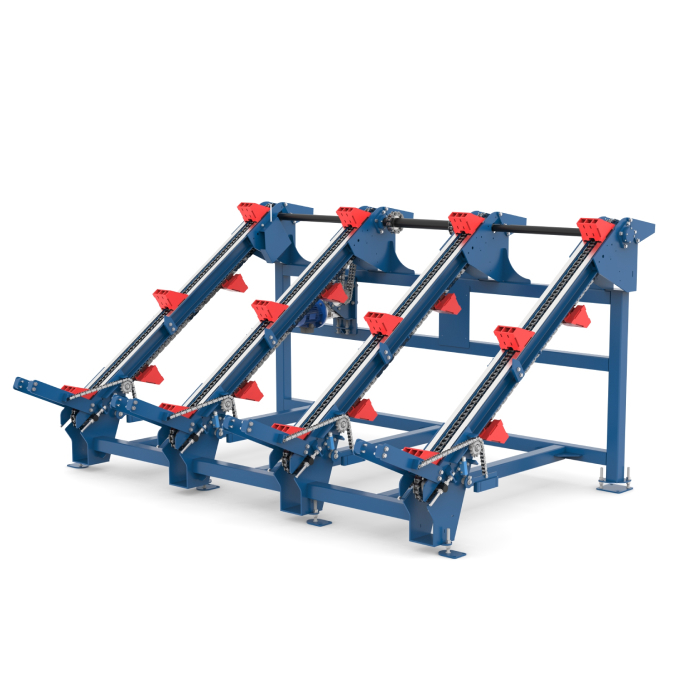 Подача осуществляется с помощью цепей с толкателями движущимися по стальным легированным вкладкам. Легированные вкладки обеспечивают стабильное положение толкателей, исключая их опрокидывание.