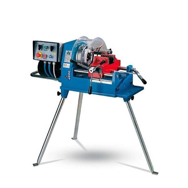 Резьбонарезной станок C.B.C. 392N производит операции по нарезке резьбы на металлических трубах и кругах диаметром от 1/4" до 2". Модель имеет вращающийся резьбонарезной блок и самоцентрирующиеся тиски для зажатия заготовки.