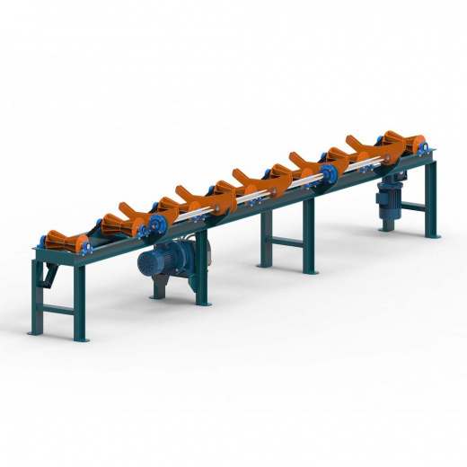Рольганг с коническими роликами — это приводное оборудование межстаночной механизации для автоматической транспортировки бревен и хлыстов с естественной кривизной. Коническая форма роликов автоматически центрирует заготовки по своей оси, обеспечивая стабильную подачу на раскряжевочные, окорочные или бревнопильные станки без ручной правки.