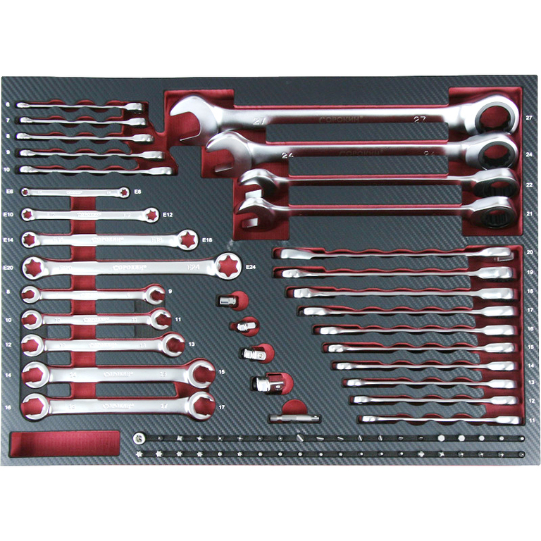 Набор в своем составе имеет комплект метрических рожково-накидных ключей с трещоточным механизмом размером до 27 мм , комплект разрезных ключей для штуцеров. Также набор содержит накидные ключи TORX. Интересным компонентом набора являются переходники, которые превращают рожково-накидной ключ в трещоточный ключ для головок, это помогает работе в труднодоступных местах. Ложементы модульных наборов изготовлены из долговечного, мягкого, стойкого к агрессивным средам пористого материала, который сверху покрыт жестким пластиком с текстурой "карбон". Это новая разработка инженеров и дизайнеров ТД СОРОКИН. Фрезерованная форма максимально деликатно удерживает инструменты, каждый в своем отделении. Инструмент изготовлен из хромованадиевой стали с защитным покрытием и финишной обработкой матовый хром. Одно из главных преимуществ модульных наборов - использование их в качестве ложемента для инструментальных шкафов серий Standart и Great . Помимо вышеперечисленных моделей шкафов, наборы могут использоваться с инструментальными тележками , а также со всеми моделями верстаков . Взять с собой в дорогу инструмент можно, положив в защитный пластиковый кейс на колесах 27.170 Комплектация Ключ рожково-накидной: 6- 7- 8- 9- 10- 11- 12- 13- 14- 15- 16- 17- 18- 19- 20- 21- 22- 24- 27 мм 19 Разрезные ключи для штуцеров: 8 х 9 - 10 x 11 - 12 x 13 - 14 x 15 - 16 x 17 5 Ключи накидные: TORX E6x8 - E10x12 - E14x18 - E20x24 4 Переходник 1/4"(M) х 10 мм (M) 1 Переходник 3/8"(M) х 13 мм (M) 1 Переходник 1/2"(M) х 19 мм (M) 1 Адаптер для бит 1/4"(F) х 10 мм (M) 1 1/4" Биты: Шестигранные: H3 - H4 - H5 - H6 - H7 5 Шлицевые: 3 - 4 - 5 - 5.5 - 6 - 7 - 8 мм 7 TX: T10 - T15 - Т20 - T25 - T30 - T40 14 PH: 1 - 2 - 3 - 4 6 PZ: 1 - 2 - 3 - 4 7 Адаптер для бит, 1/4"(M) х 1/4"(M), 51 мм 1 Адаптер для бит, 1/4"(F) х 1/4"(F) 1
