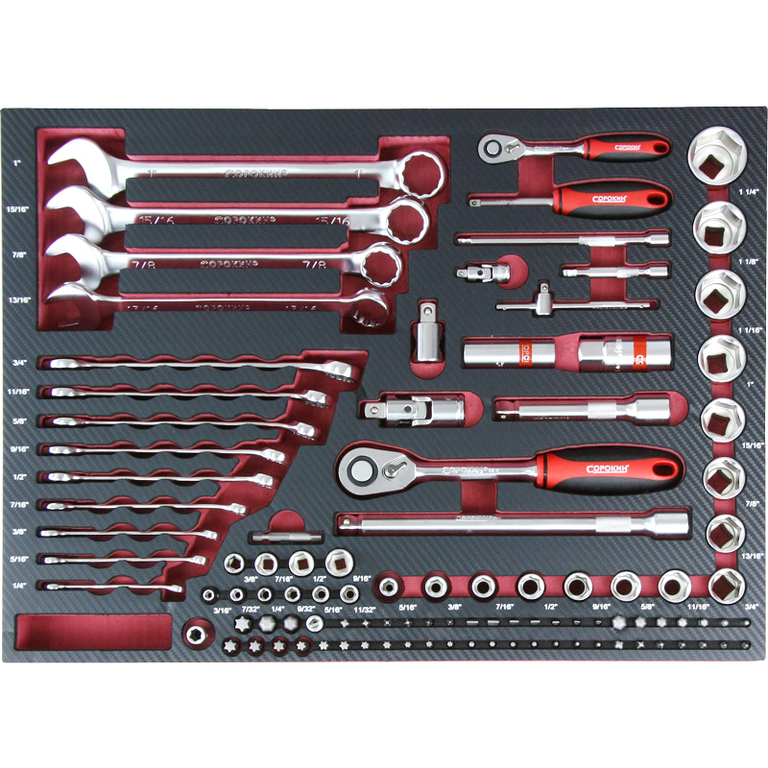 Комбинированный набор дюймовых гаечных ключей включает набор головок с присоединительным квадратом 1/2 и 1/4 дюйма, набор рожково-накидных ключей и расширенный набор бит. Ложементы модульных наборов изготовлены из долговечного, мягкого, стойкого к агрессивным средам пористого материала - этиленвинилацетат, который сверху покрыт жестким пластиком с текстурой "карбон". Это новая разработка инженеров и дизайнеров ТД СОРОКИН. Фрезерованная форма максимально деликатно удерживает инструменты, каждый в своем отделении. Инструмент изготовлен по самым передовым технологиям и с применением инновационных решений. Головки имеют форму SUPER LOCK, ключи этой формы не наносят повреждений граням болтов и позволяют отвернуть болты даже с сорванными гранями. Ключи изготовлены из высококачественной хромованадиевой стали, имеют и имеют покрытие матовый хром. Трещотка оборудована долговечным рабочим механизмом с 72-мя лепестками. Одно из главных преимуществ модульных наборов - использование их в качестве ложемента для инструментальных шкафов серий Standart и Great Помимо вышеперечисленных моделей инструментальных шкафов, наборы могут использоваться с инструментальными тележками , а также со всеми моделями верстаков . Взять с собой в дорогу инструмент можно, положив в защитный пластиковый кейс на колесах 27.170 Комплектация 1/4" Головки шестигранные 3/16 - 7/32 - 1/4 - 9/32 - 5/16 - 11/32 - 3/8 - 7/16 - 1/2 - 9/16 10 1/4" Ключ трещоточный 72 "зубца" 1 1/4" Удлинители 3" - 6" 2 1/4" Карданный шарнир 1 1/4" Вороток Т-образный 1 1/4" Адаптер для бит, 1/4"(F) x 1/4"(F) 1 1/4" Отвертка с присоединительным квадратом, 150 мм 1 1/2" Головки шестигранные 5/16-3/8-7/16-1/2-9/16-5/8-11/16-3/4-13/16-7/8-15/16-1-1x1/16-1x8-1x1/4 15 1/2" Головки свечные шестигранные 5/8 - 13/16 2 1/2" Ключ трещоточный 72 "зубца" 1 1/2" Удлинители 5"-10" 2 1/2" Карданный шарнир 1 1/2"(M)x3/8"(F) Вороток Т-образный 1 Ключи комбинированные: 1/4 - 5/16 - 3/8 - 7/16 - 1/2 - 9/16 - 5/8 - 11/16 - 3/4 - 3/16 - 7/8 - 15/16 - 1" 13 1/4" Биты 25мм: Шестигранные: 1/8 - 5/32 - 7/32 - 1/4 - 9/32 - 5/16 - 3/8 7 Шлицевые: 1/8 - 5/32 - 3/16 - 1/4 - 5/16 7 TX: T10 - T15 - Т20 - T25 - T30 - T40 14 PH: 1 - 2 - 3 - 4 6 PZ: 1 - 2 - 3 - 4 7 Адаптер для бит, 1/4"(M) x 1/4"(M), 51 мм 1 8 мм Биты: Шестигранные: 3/8 - 7/16 2 TX: T40 - T45 - T47 - T50 - T55 5 1/2"(F) x 8 мм (F) Адаптер для бит 1
