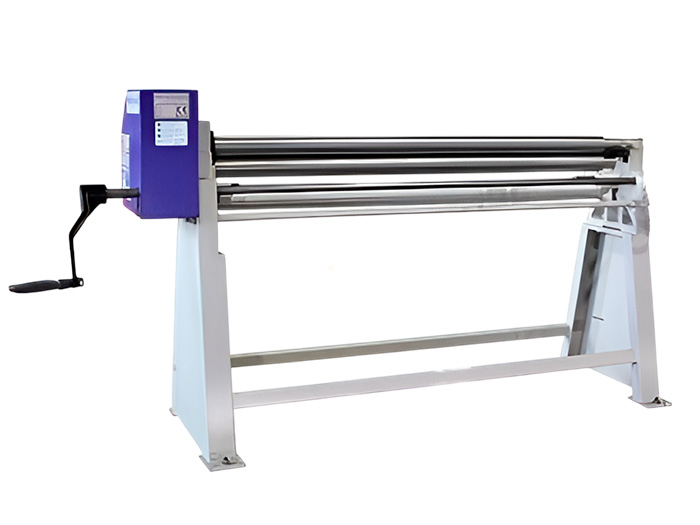 • Управление положением заднего и нижнего валов осуществляется вручную с помощью маховиков, позволяя оператору точно регулировать давление и радиус гиба в зависимости от материала;