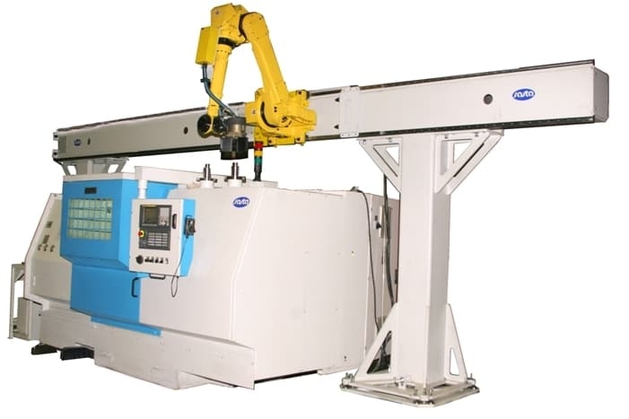 Гибкий производственный модуль с портальным манипулятором Предназначен для автоматической комплексной обработки деталей типа валов и фланцев. В состав гибкого производственного модуля входят: токарный многофункциональный станок с ЧПУ на базе САТ400 или САТ630 производства ОАО «САСТА»; портальный манипулятор производства фирмы «Fanuc Robotics Deutschland Gmbh» (Германия) с роботом Fanuc М-710iC/70T (Япония); стол-паллета для укладки заготовок и обработанных деталей. Грузоподъёмность робота — 70 кг (по заказу может комплектоваться роботом большей или меньшей грузоподъёмности). Захват робота — двойной. Число управляемых осей — 6. Скорость быстрых перемещений — 2 000 мм/c. Манипулятор берёт с паллеты заготовку и устанавливает её в патрон токарного станка. После обработки заготовки с одной стороны манипулятор переворачивает её, а после полной обработки — вынимает из станка, устанавливает в патрон следующую заготовку, предварительно взятую с паллеты, и укладывает на паллету готовую деталь.