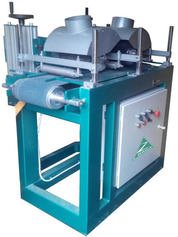 - Функционально состоит из основания с транспортерной подачей заготовки и 2-х регулируемых по высоте узлов с цилиндрическими щетками.