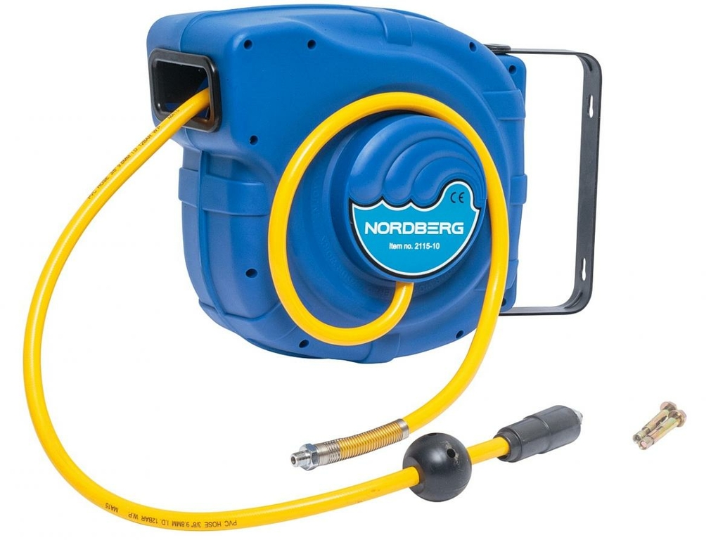 Шланг на самоскручивающейся катушке Nordberg 2115-10 Nordberg предназначен для подачи воздуха от компрессора к пневмоинструменту.
