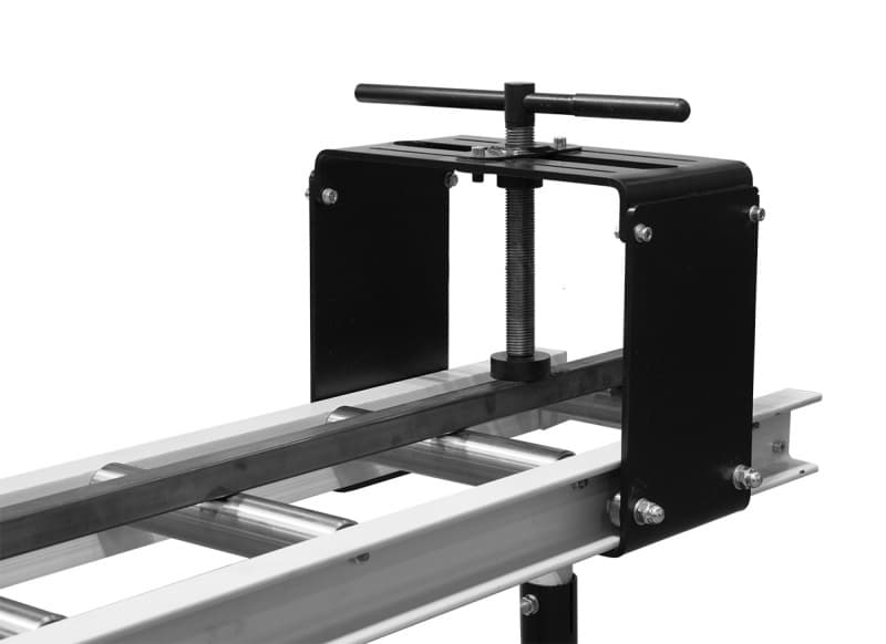 Прижим пакетной резки Stalex на рольгангах - предназначен для фиксации длинномерных заготовок в пакет (т.е. нескольких заготовок одновременно) на рольгангах. При подаче к станку, а также при зажатии в тисках на ленточнопильном станке длинные заготовки небольшого размера могут расползаться и терять форму пакета – что приводит к дополнительной потере времени и точности пиления. Прижим притягивает и фиксирует пакет прямоугольных заготовок ходовым винтом при помощи ручного вращения.