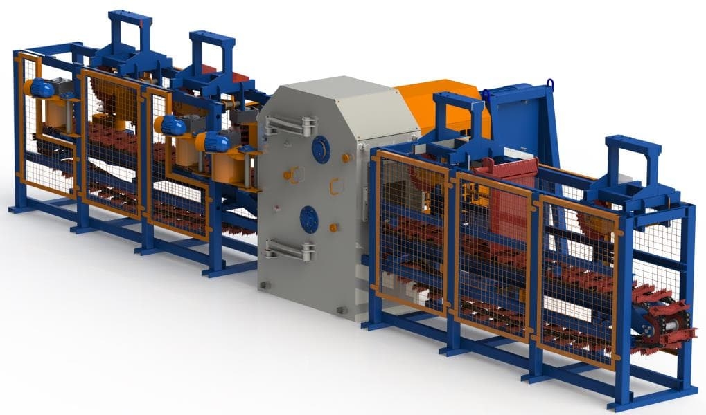 Подача сырья в пильный блок, осуществляется с помощью гусеничной транспортной системы. Фиксация бревна происходит с помощью автоматических пневмо-прижимов.