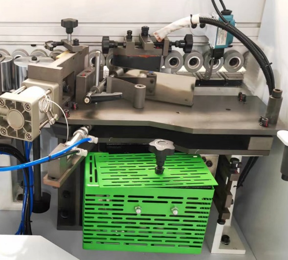 ПРЕСС ГРУППА Состоит из одного ведущего ролика и трех до прессовочных роликов, которые обеспечивают надежную фиксацию кромочного материала на торец заготовки. На каждом ролике установлен отдельный пневмоцилиндр. 2 ролика из 4-х роликов имеют разный конус, что обеспечивает распределение усилия прижима по толщине детали. Давление на пресс группе задается с помощью пневматики, что гарантирует равномерное распределение усилий на кромку во время приклеивания. |