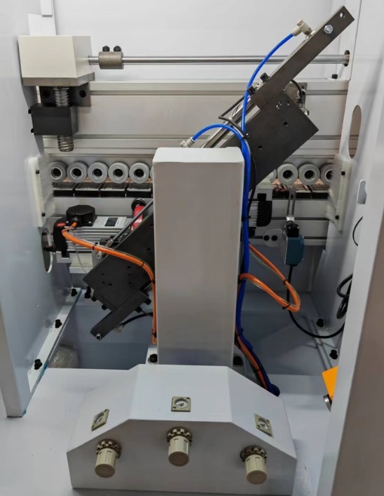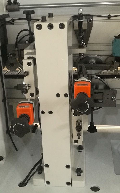 - Фрезерный узел для снятия свесов с вертикальной и горизонтальной настройкой, с двумя высокочастотными двигателями по 0,75 кВт. Радиус фрезы 2 мм;