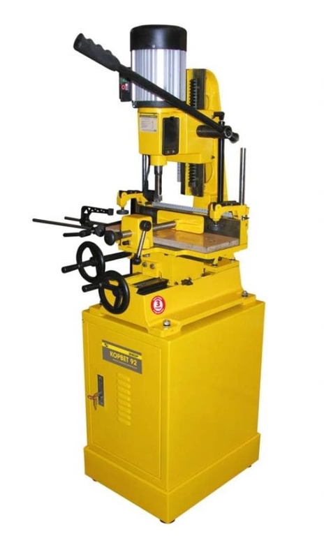 Деревообрабатывающий сверлильно-долбежный станок «Корвет-92» предназначен для выборки в изделиях из древесины отверстий, гнезд, пазов и шипов прямоугольной формы. Этот станок незаменим при изготовлении пазо-шиповых соединений. Вырубка отверстий осуществляется насадкой пазовальной, состоящей из спирального сверла и долота квадратного сечения.