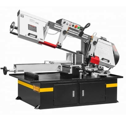 В рабочей зоне резания полотно точно ведется двумя направляющими головками. Станок имеет неподвижные тиски и поворотный механизм рамы, для пиления под углом необходимо изменить положение рамы относительно неподвижных тисков. Высота полотна 27мм позволяет пилить c высокой точностью и параллельностью полые и профильные заготовки под различными углами, в том числе и сплошные заготовки.