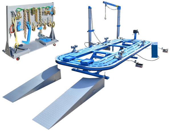 Платформенный стапель* с полным гидравлическим подъемником для восстановления геометрии кузова автомобилей, имеющих повреждения любой сложности.Платформа стапеля имеет продольные пазы, что позволяет устанавливать 4 кузовных зажима в любом месте платформы. Более того, наличие пазов позволяет полностью использовать поверхность платформы в процессе правки кузова.