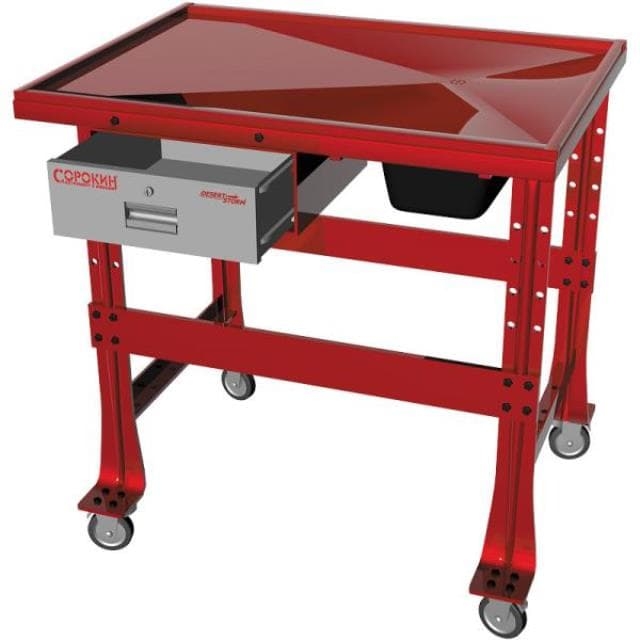 Стол для очистки со сливом Сорокин 10.51 - применяется в различных мастерских для очистки, обработки и обезжиривания деталей химическими растворами. Стол имеет съемный поддон, столешницу с отверстием для слива, запираемый выдвижной ящик и транспортировочные колеса.