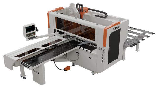 Filato Drillmatic 612-2H - современный высокоскоростной сверлильно-присадочной центр с ЧПУ. Предназначен для высокоточного сверления сквозных и глухих отверстий в торцах и плоскостях мебельных щитов с шести сторон, выборки пазов при помощи пазовальной пилы, а также фрезерной обработки с помощью двух фрезерных агрегатов.