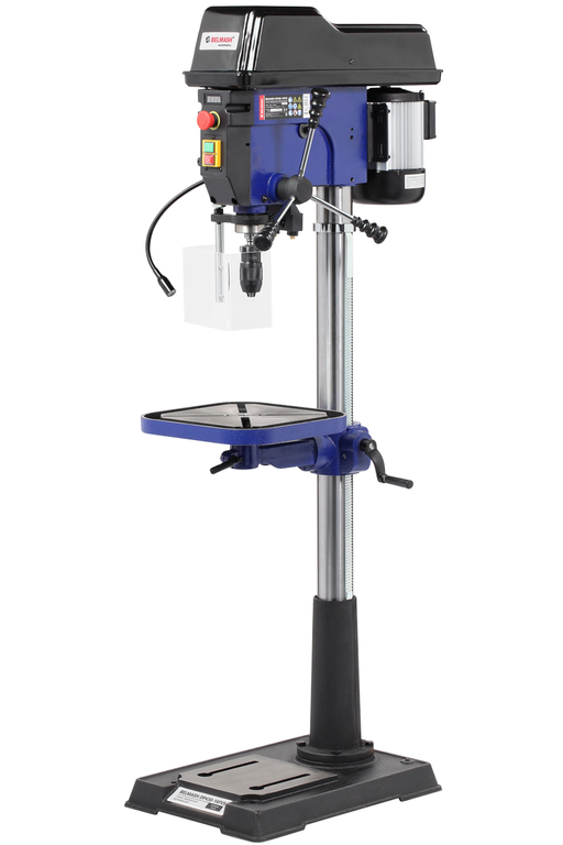 Станок предназначен для обработки различных материалов вращающимся режущим или шлифующим инструментом, с целью получения сквозных или глухих отверстий, растачивания, зенкерования. Модель DP430-16FVS одна из самых интересных в линейке по функционалу. Стол, опора и корпус сверлильной головки выполнены из чугуна, что придает станку серьезный вес. Установка напольная. На основании имеется четыре отверстия для дополнительной фиксации станка. Двигатель асинхронный, мощный, 1100 Вт. Благодаря вариатору станок имеет диапазон скорости вращения шпинделя от 440 до 2100 об./мин., что необходимо при различных операциях и материалах. Рукоятка регулировки выведена на левый торец сверлильной головки. Заготовку можно крепить как к рабочему столу, так и к основанию. В комплекте предусмотрены тиски. Для их крепления есть четыре Т-образных паза на рабочем столе и два паза на основании. Максимальный ход пиноли шпинделя 150 мм. Возможно ограничение хода пиноли, путем перемещения стопора по планке. Наконечники тройной рукояти удобной формы, что способствует плавной подаче сверла к заготовке. Патрон быстрозажимной с максимальным диаметром зажимаемого хвостовика инструмента 16 мм, посадка B16. На колонне (ее диаметр 80 мм) имеется зубчатая рейка для плавного поднятия/опускания стола, его положение настраивается с помощью рукоятки. Управление станком осуществляется двумя кнопками – «пуск», «остановка». Имеется аварийный выключатель. Следует обращать внимание на защитный экран и крышку ременной передачи, при их открытом состоянии станок не запуститься, так как установлены микровыключатели. Кроме вышеперечисленного станок оснащен: - индикацией скорости вращения шпинделя; - подсветкой рабочего стола; - кнопкой аварийной остановки; - лазером-указателем.