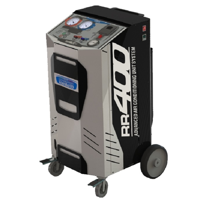 Станция для заправки автомобильных кондиционеров TopAuto RR400 для обслуживания автомобильных систем кондиционирования с фреоном R-134a. Функции: откачивание и очистка хладагента из системы, отделение и последующий сброс масла, вакуумирование системы, автоматическая заправка фреона и масла.