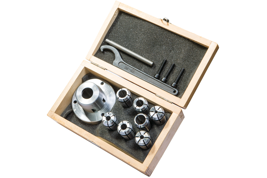 - Цанговый патрон с возможностью быстрой замены цанг для различных диаметров инструментов