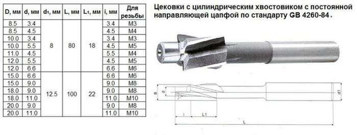 Изготовлены по стандарту GB4260-84 D x d x L (диаметр реж. части х диаметр цапфы х общая длина цековки), под М8, диаметр хвостовика 12.5мм. Цековки цилиндрические с постоянной направляющей цапфой тип 1 предназначены для обработки опорных поверхностей под крепежные детали. ГОСТ26258, 26259-87