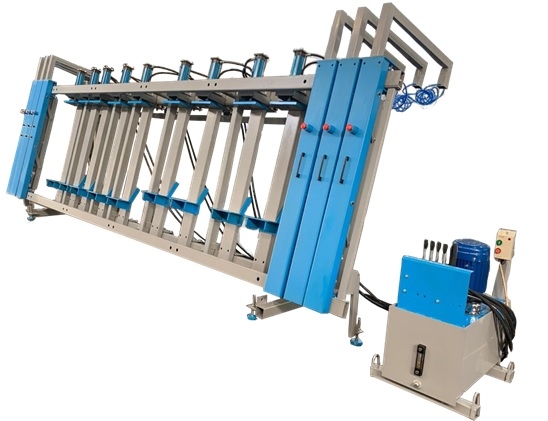 Гидравлические блоки снабжены системой устойчивости к высокому давлению и защитой от протекания. Пневматические откатные фронтальные прижимы удобно и быстро устанавливаются и автоматически с помощью кнопки зажимают пакет на необходимое усилие. Вертикальные гидравлические прижимы SLU перемещаются по длине пресса. Гидростанция оснащена 2-х или 3-ёх поточным насосным агрегатом, что обеспечивает регулировку усилия гидроцилиндров в диапазоне от 1 до 10 тонн и позволяет разделять пресс на несколько зон склеивания.