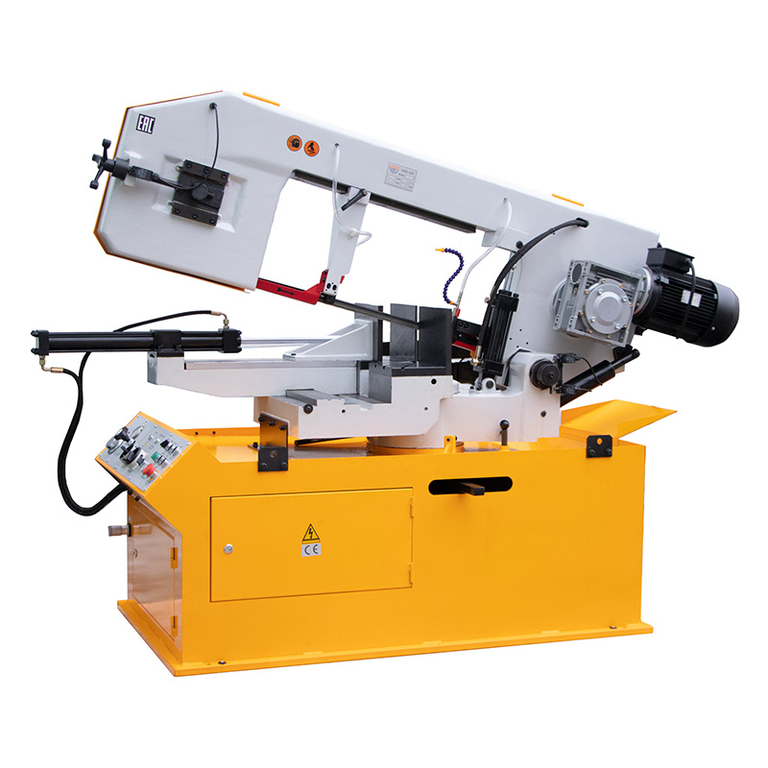 Модель оснащена гидравлическими тисками и гидроприводом с регулировкой подачи пильной рамы на деталь при резке.