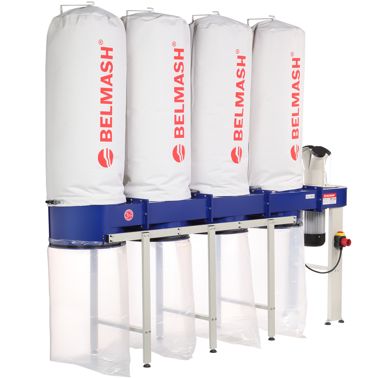 Монтаж/демонтаж фильтр-мешков и мешков-стружкосборников не требует ни специального инструмента, ни большого количества времени, благодаря специальным зажимам. Фильтр-мешки очищаются без снятия, путем стряхивания пыли внутрь. Уровень очистки составляет 5 мкм, этого достаточно для работы не только с распиловочными и строгальными станками, но и с оборудованием, дающие мелкую взвесь – шлифовальными, фрезерными, рейсмусовыми станками. Четыре вместительных стружкосборника, объемом по 160 литров каждый, способствуют длительной работе без их частой смены.